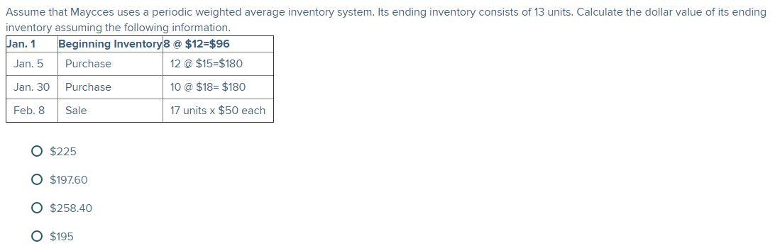 Maycces uses periodic weighted average inventory system. Calculate the dollar value of its ending inventory assuming following info.
